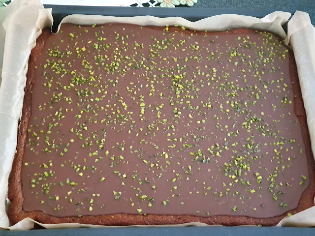 Für die Schoko-Ganache die Schokolade in Stücke brechen, im Wasserbad zusammen mit der Sahne langsam schmelzen und vorsichtig unterheben Die Creme etwas abkühlen lassen und auf den Kuchen streichen. Mit gehackten Pistazien bestreuen, die Schokolade braucht etwas ehe sie fest wird, wenn möglich kalt stellen.